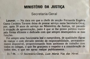 Hoje, olha para trás com alguma nostalgia. Gostou do que fez e orgulha-se do percurso. O trabalho foi mais do que uma obrigação: foi uma casa. “Ali era a minha segunda casa. (…) Apesar de estar [reformada], não gosto de estar em casa. Mas agora tenho que estar, não é? Mas…é muito melhor a gente estar a trabalhar e ter um ambiente bom.” Fernanda despediu-se do trabalho com a atribuição pelo Secretário-Geral do Ministério da Justiça de um louvor público pela sua dedicação e profissionalismo ao longo de uma vida inteira ao serviço do Estado.